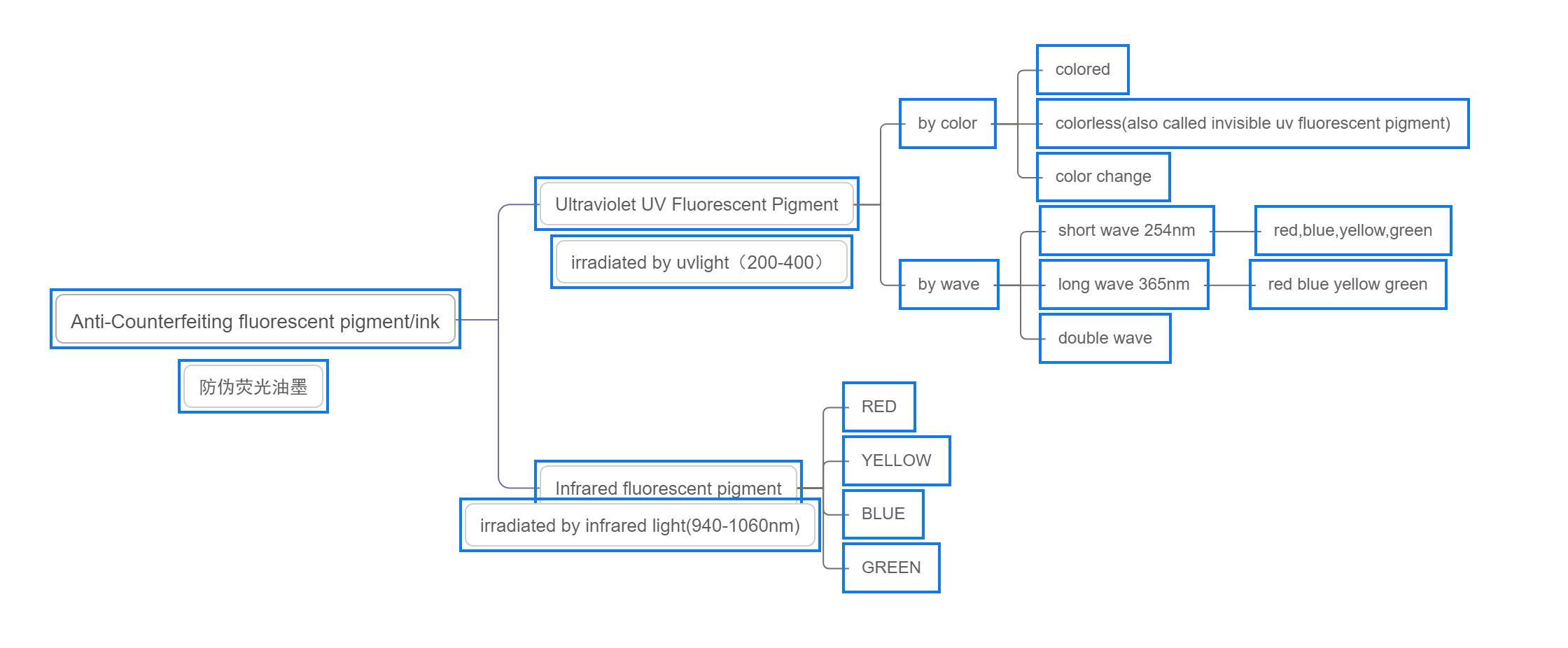 Anti-Counterfeiting fluorescent pigment can be divided into Ultraviolet UV Fluorescent Pigment and infrared fluorescent pigment.